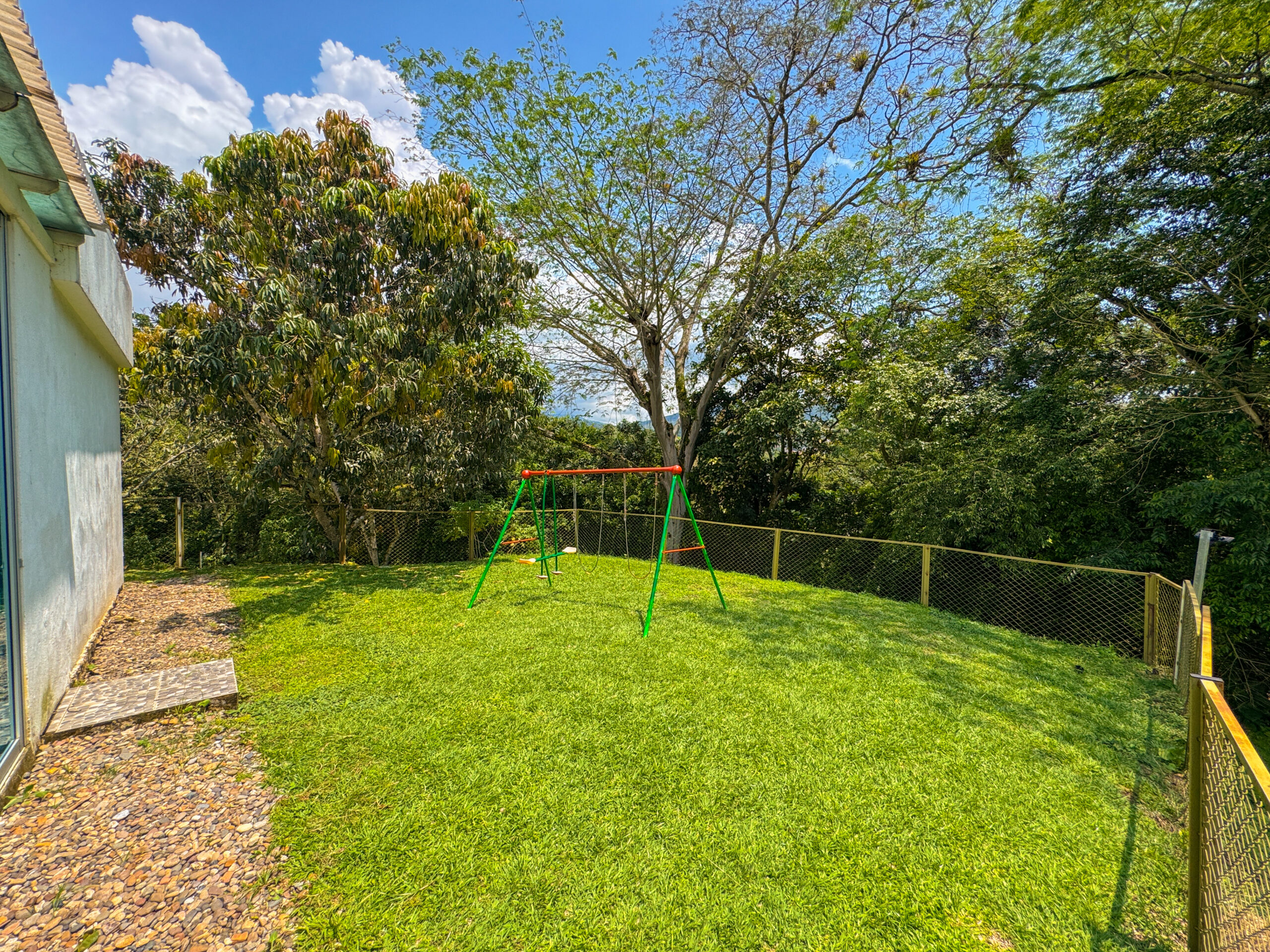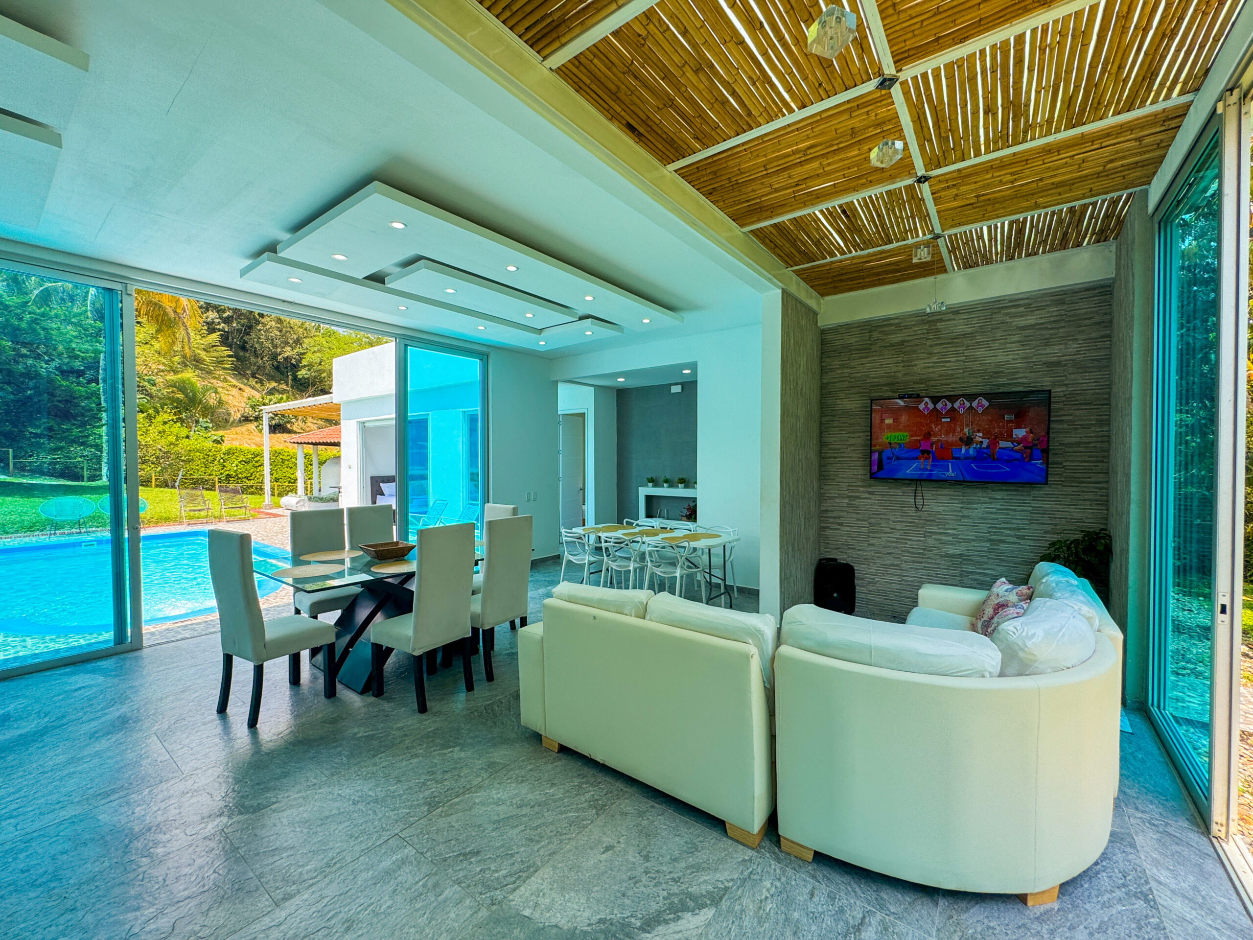 Cuenta con amenidades como sala-comedor, cocina completamente dotada, baño social, parrilla y Bbq, juegos de mesa, mesa de ping pong, smartv, wifi, piscina, parqueaderos, amplias zonas verdes