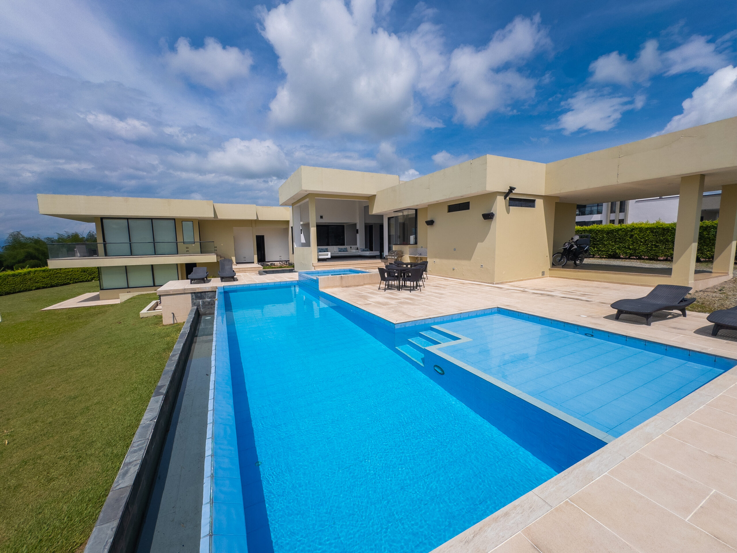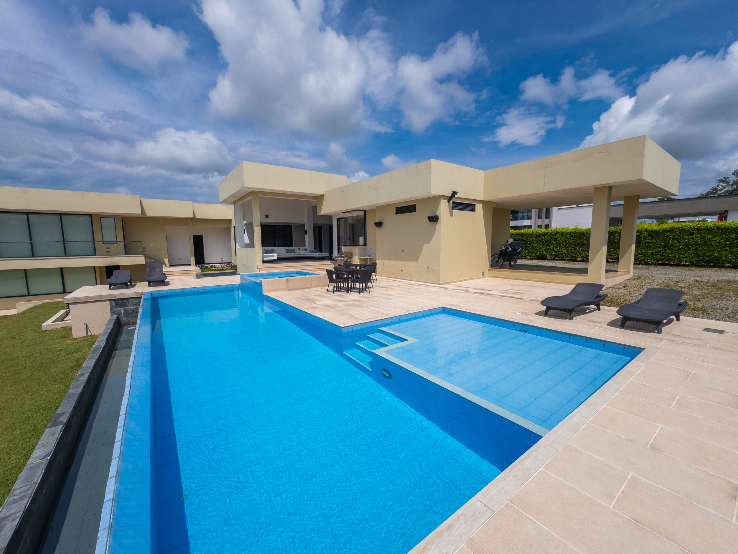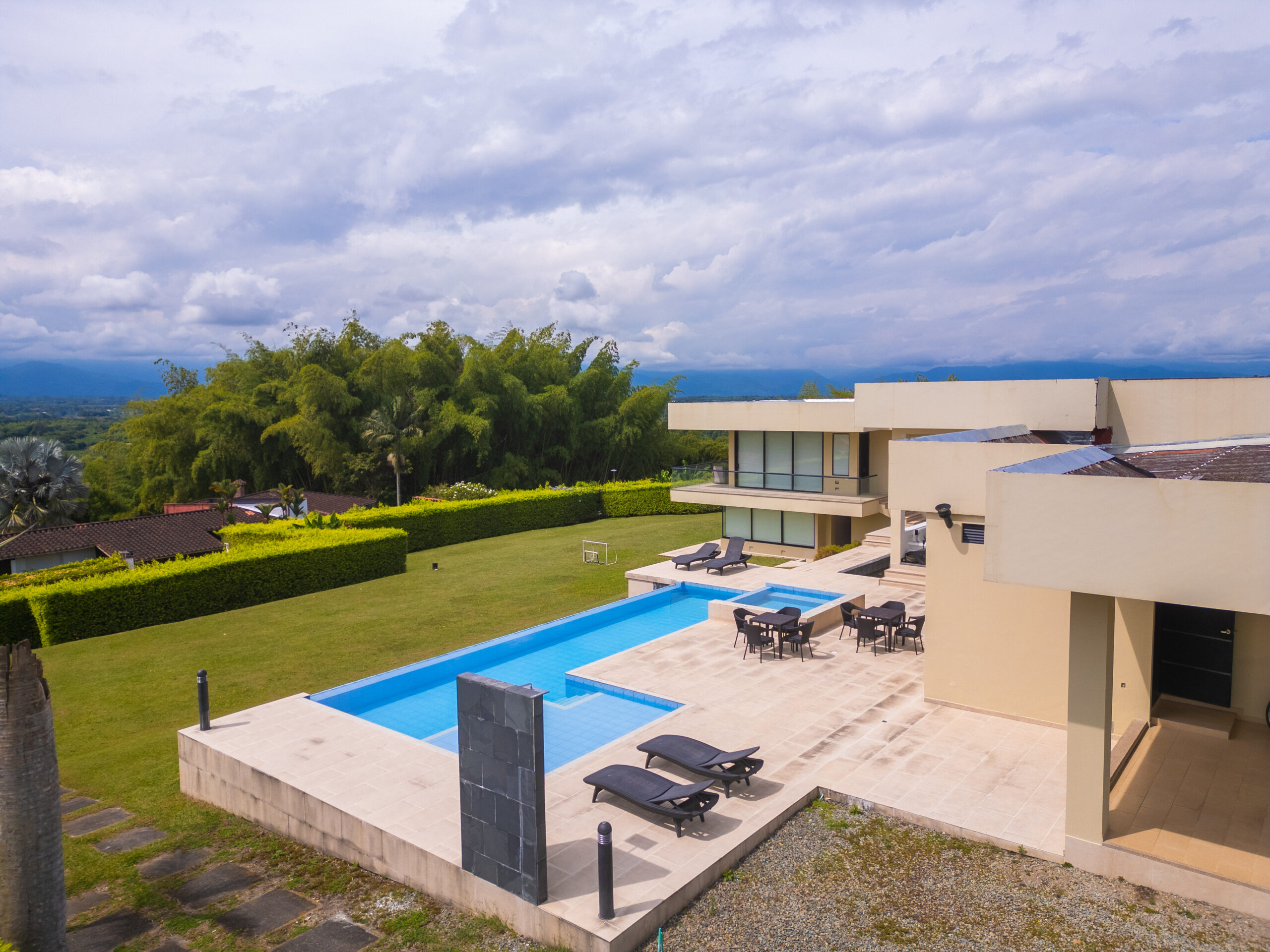 Cuenta con amenidades como cocina equipada, zona bbq, piscina, jacuzzi, amplia sala de star , wifi, parlantes, zonas verdes, juegos de mesa, cancha mini futbol, estudio con zona de trabajo y televisión.