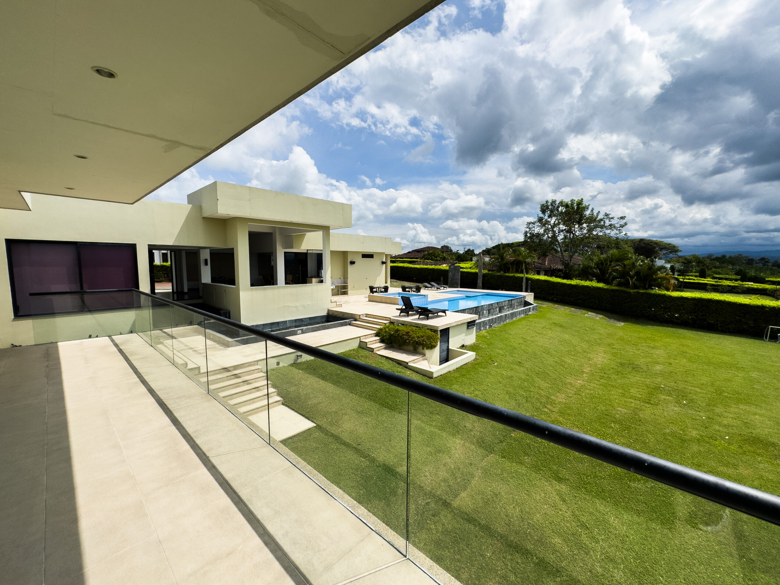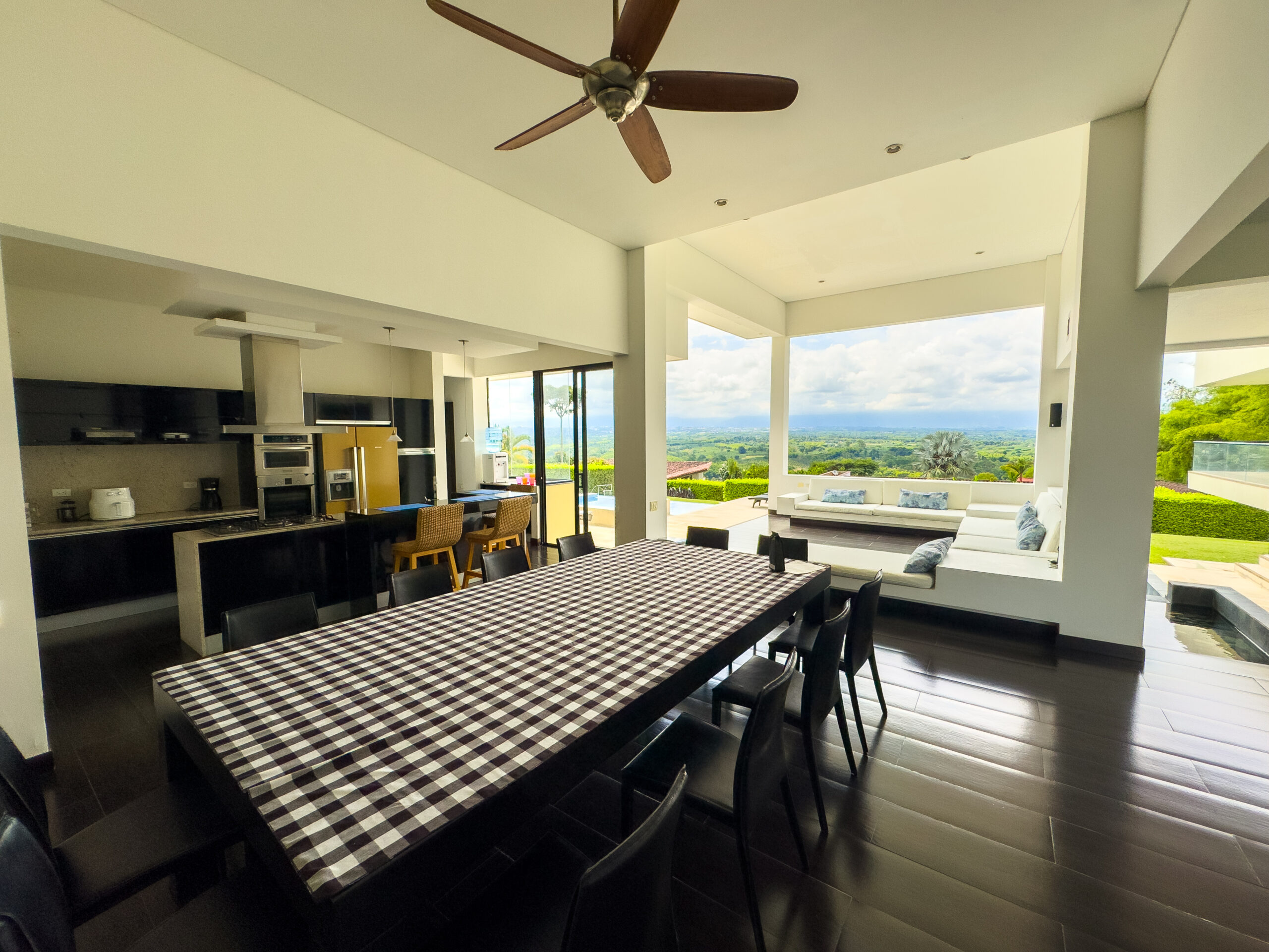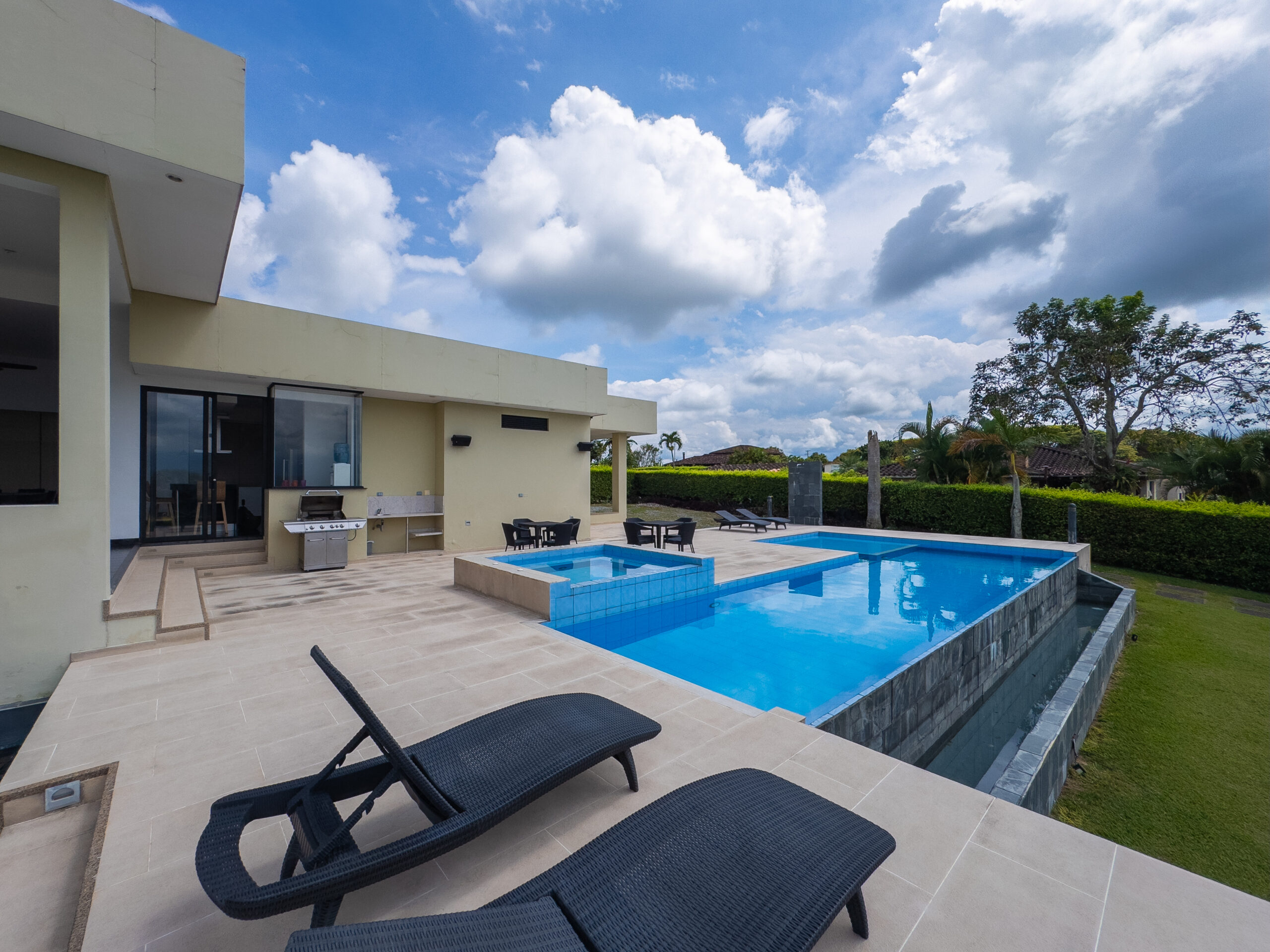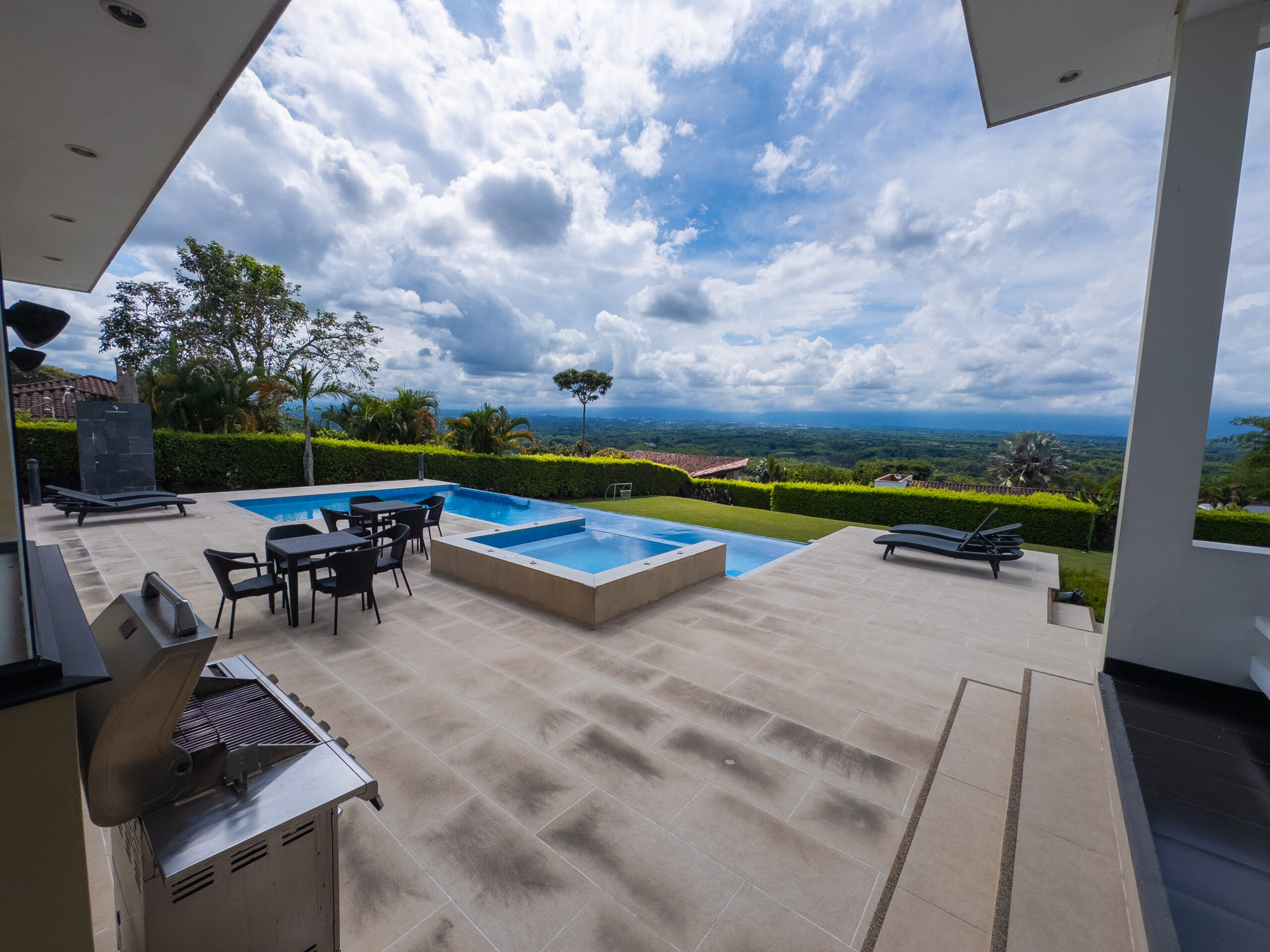 Cuenta con amenidades como cocina equipada, zona bbq, piscina, jacuzzi, amplia sala de star , wifi, parlantes, zonas verdes, juegos de mesa, cancha mini futbol, estudio con zona de trabajo y televisión.