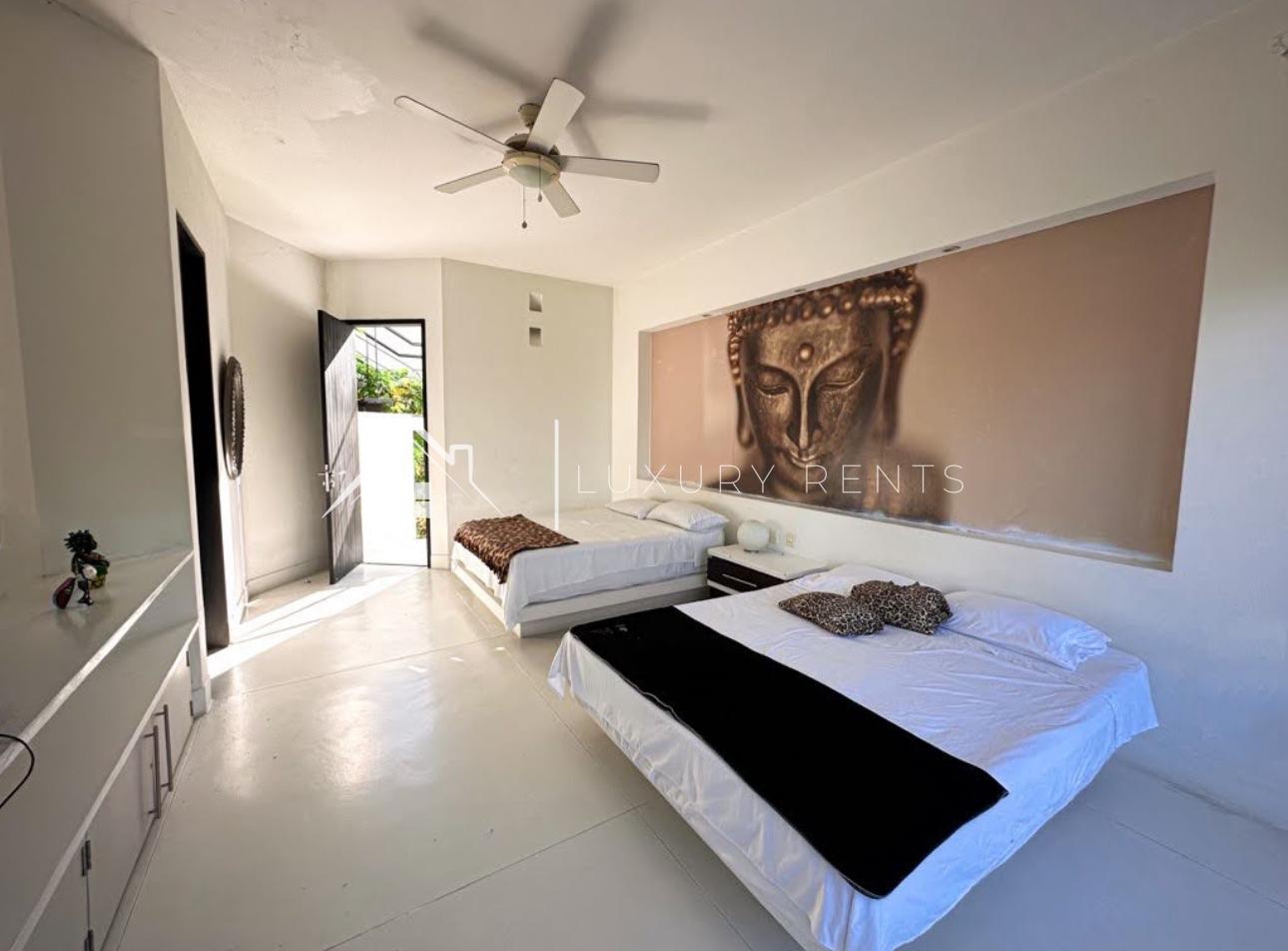 Habitación 4: dos camas dobles, baño privado, ventilador y tv