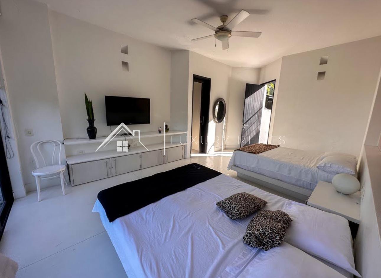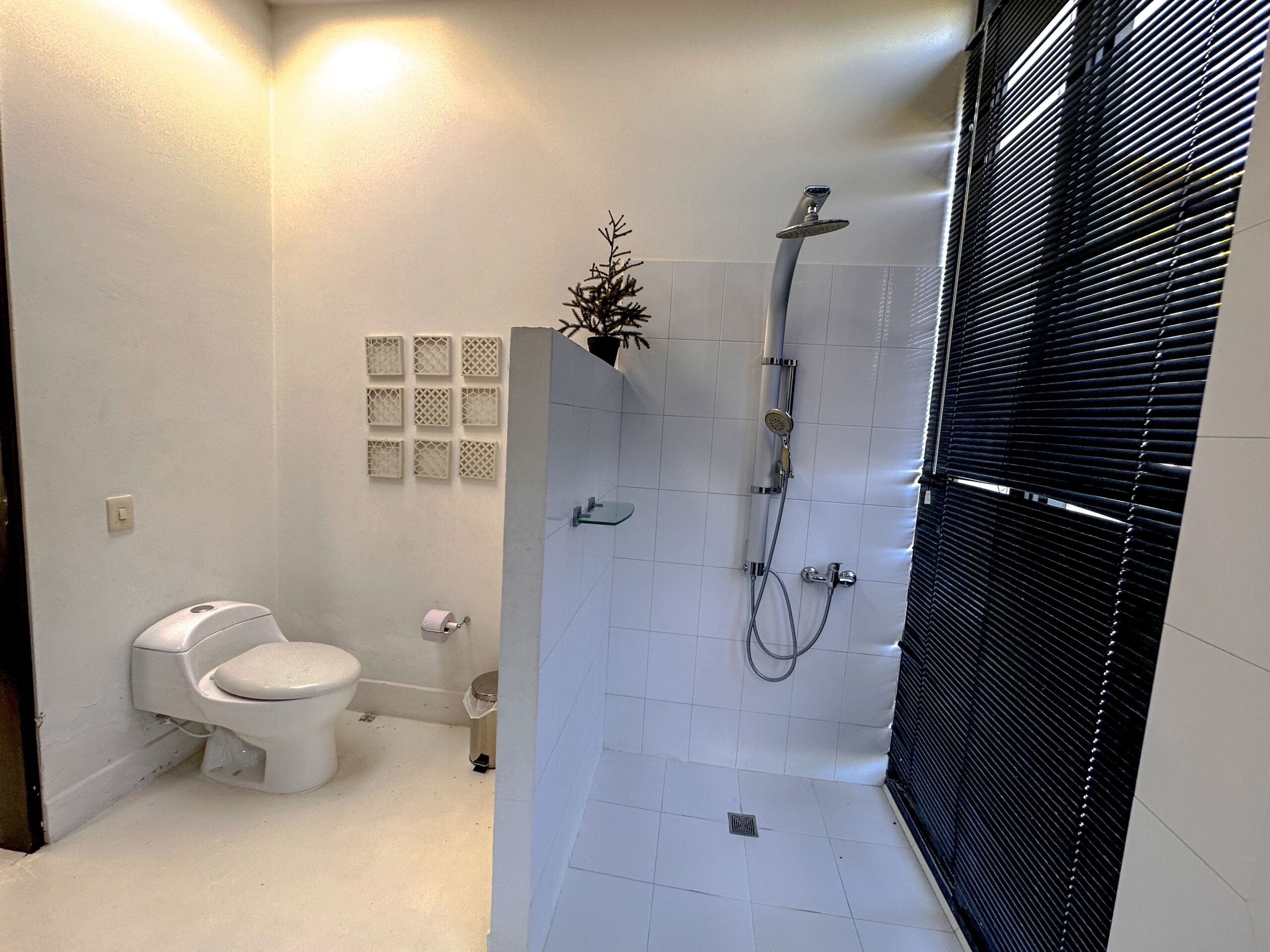 Habitación 5: dos camas dobles, baño privado, ventilador y tv