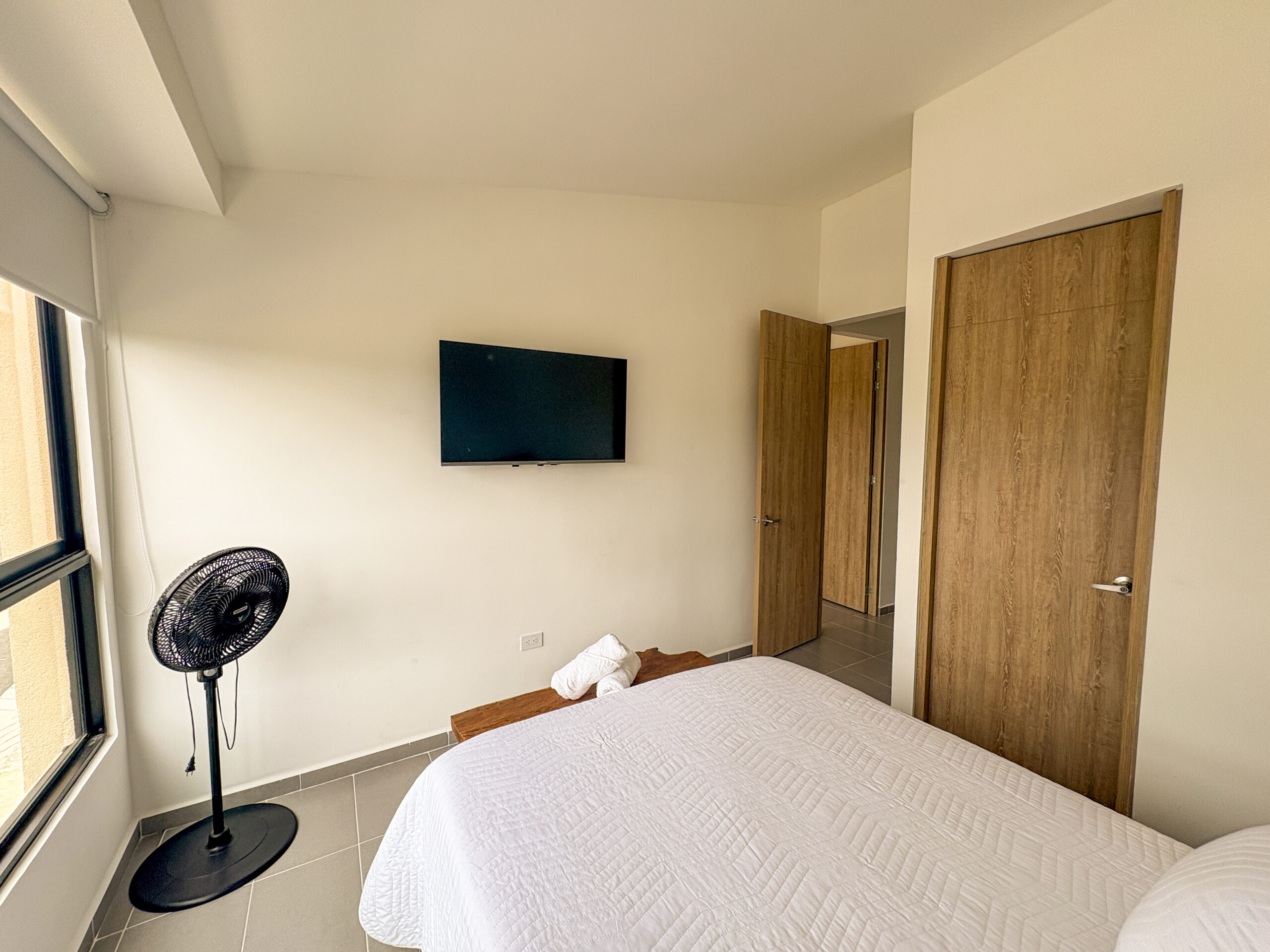 Habitación 1: cama doble, television, ventilador, baño privado y vestier