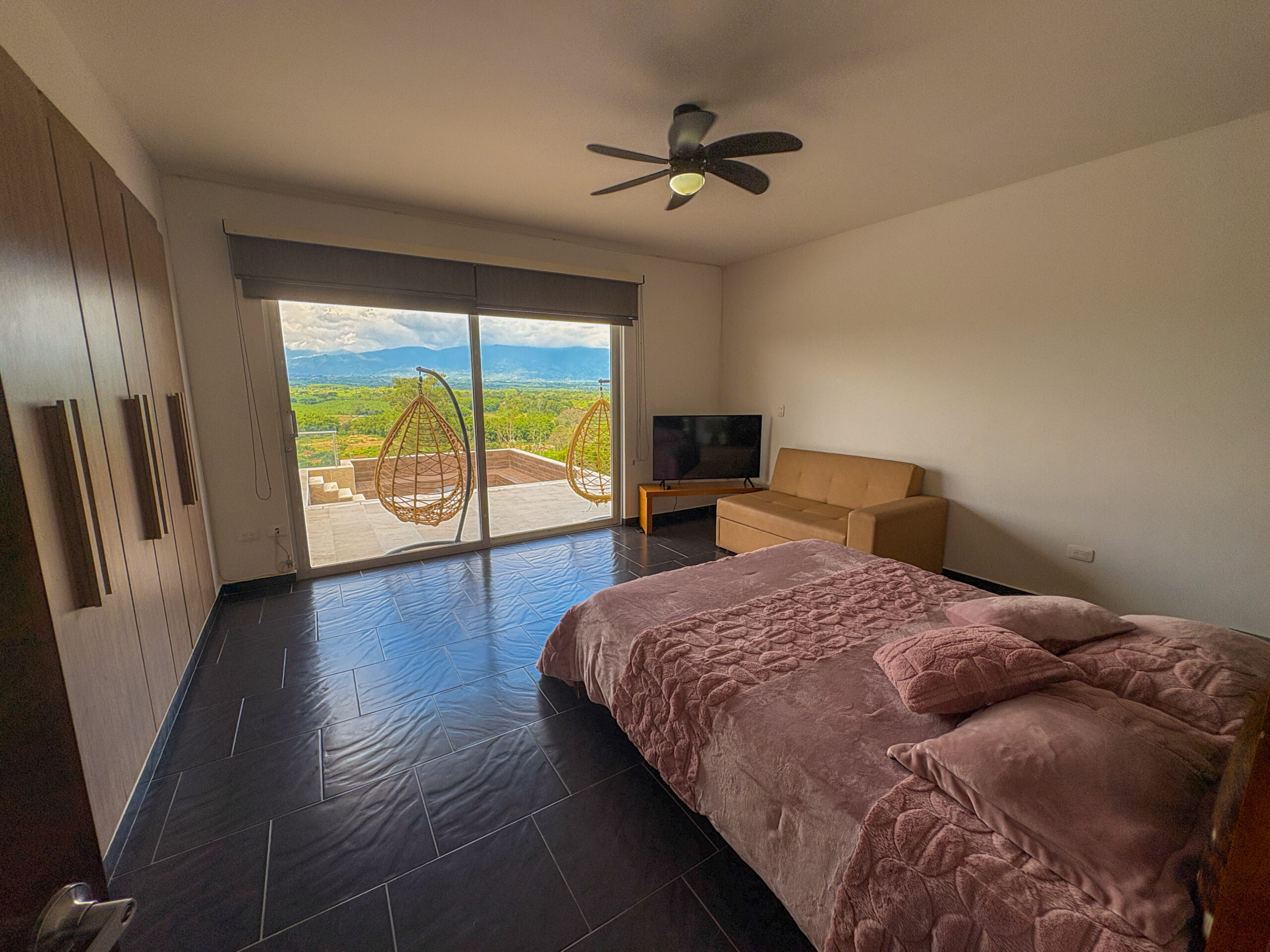 Habitación 3: Cama queen, sofa cama doble, tv, baño privado, ventilador, closet