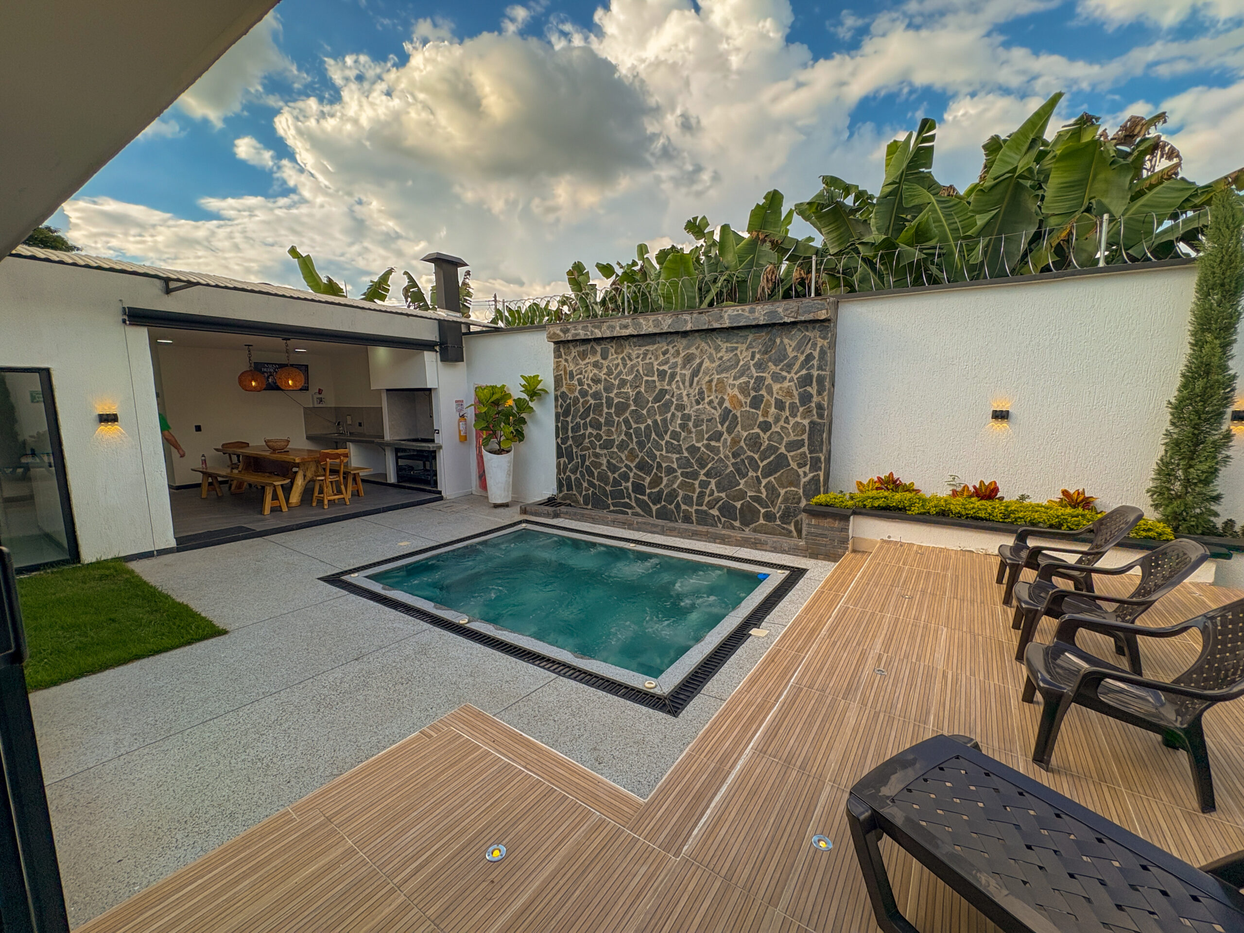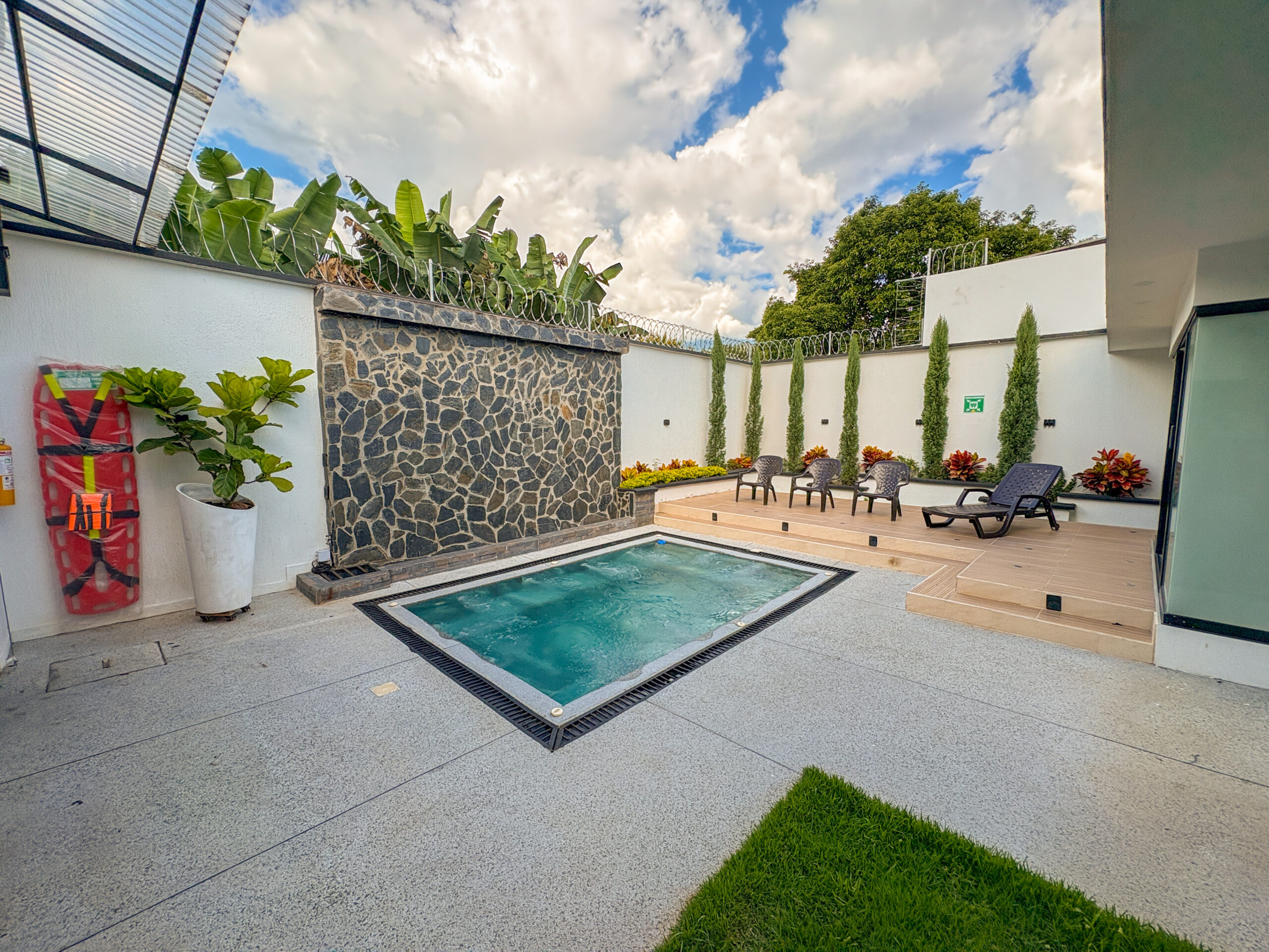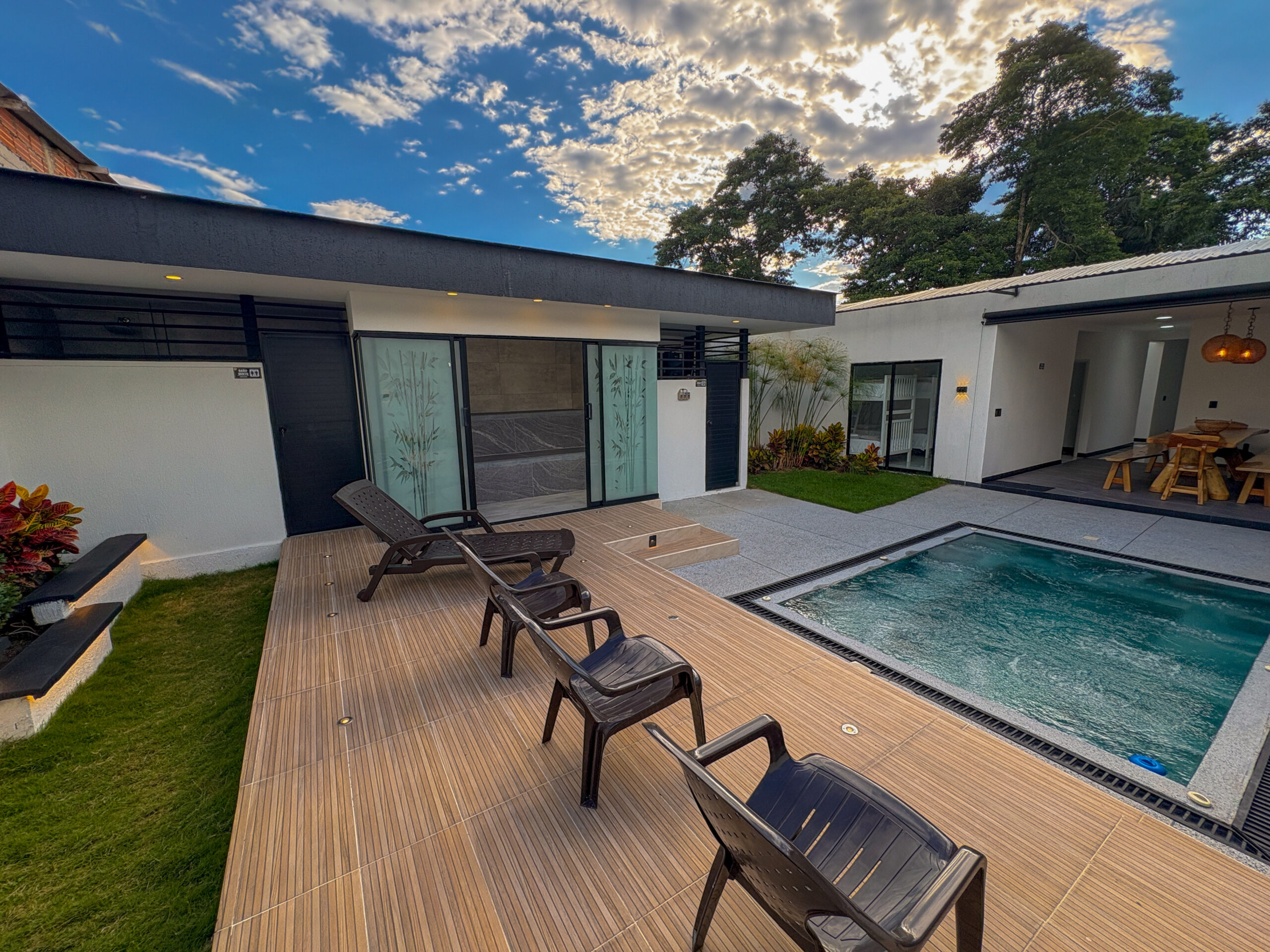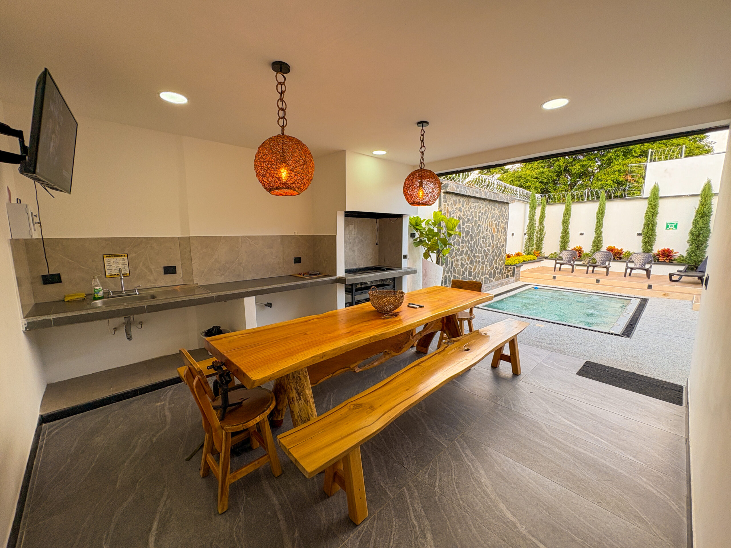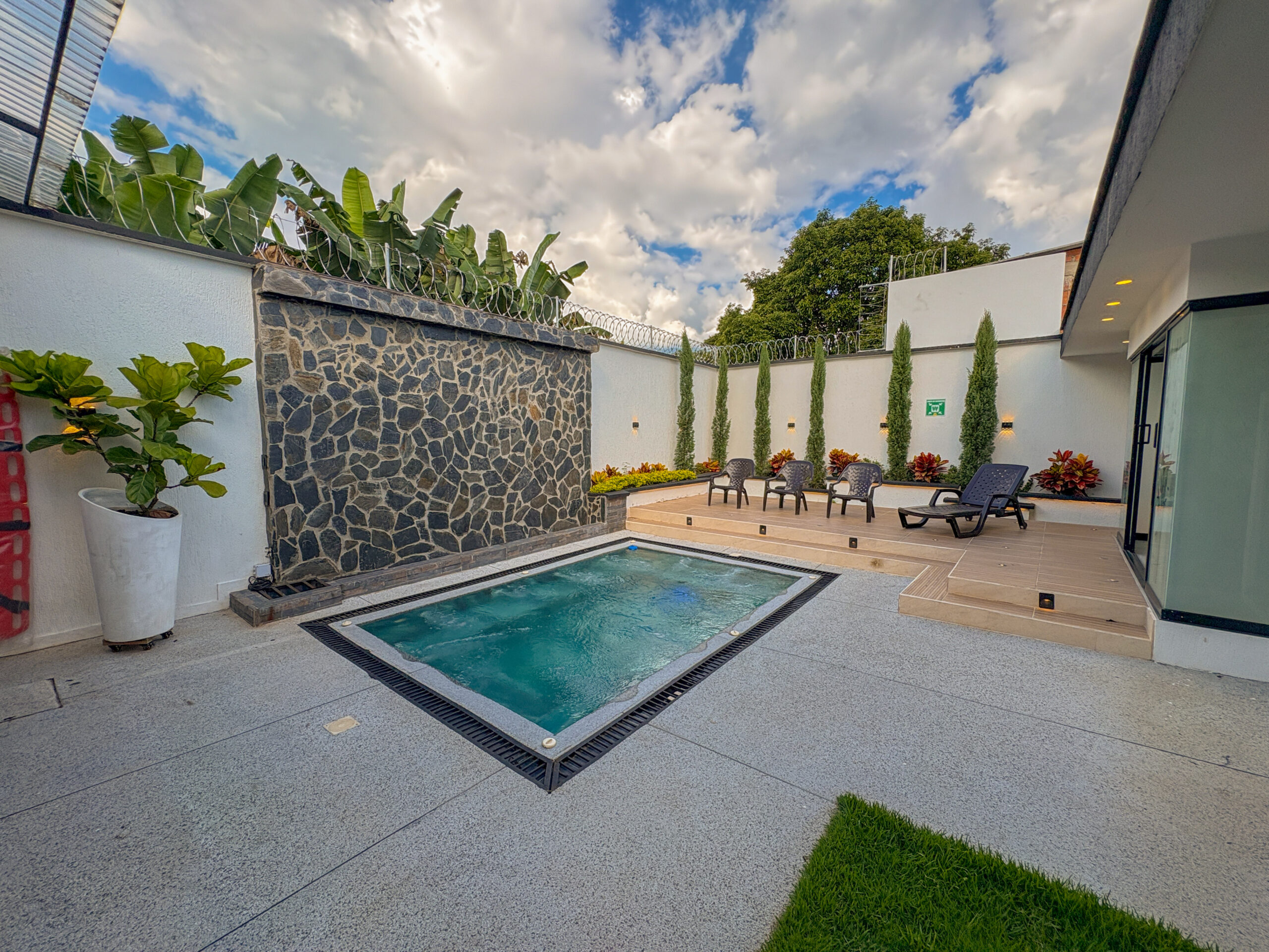 Cuenta con amenidades como jacuzzi climatizado con cascada, sofa cama doble, zona de bronceo, zona Bbq, sala de star con smrtv, cocina equipada, sauna, baño social