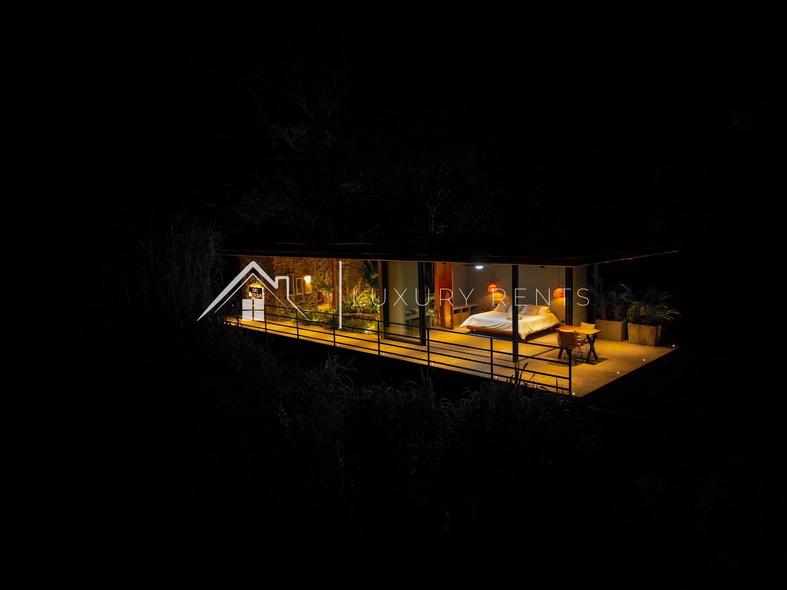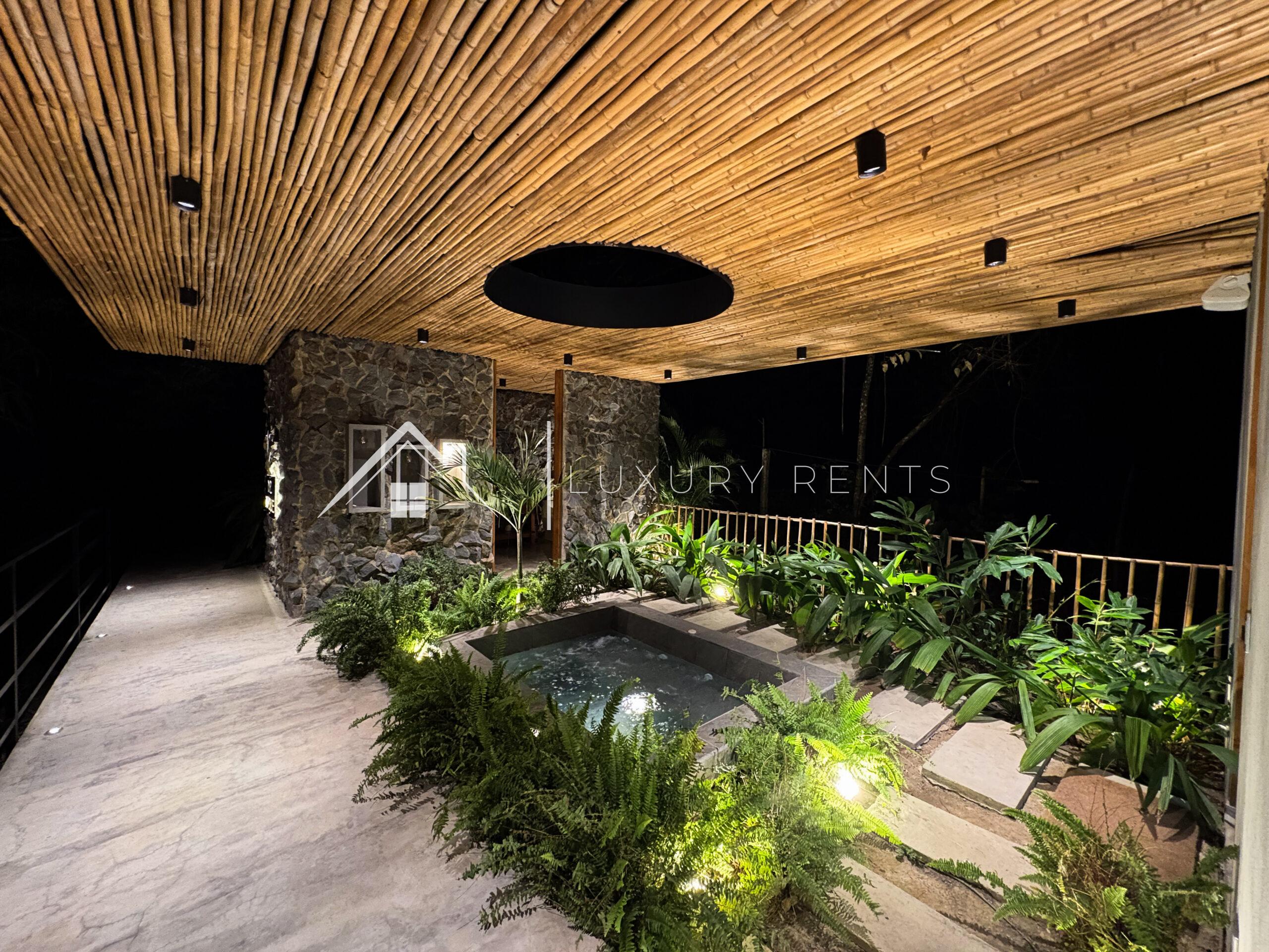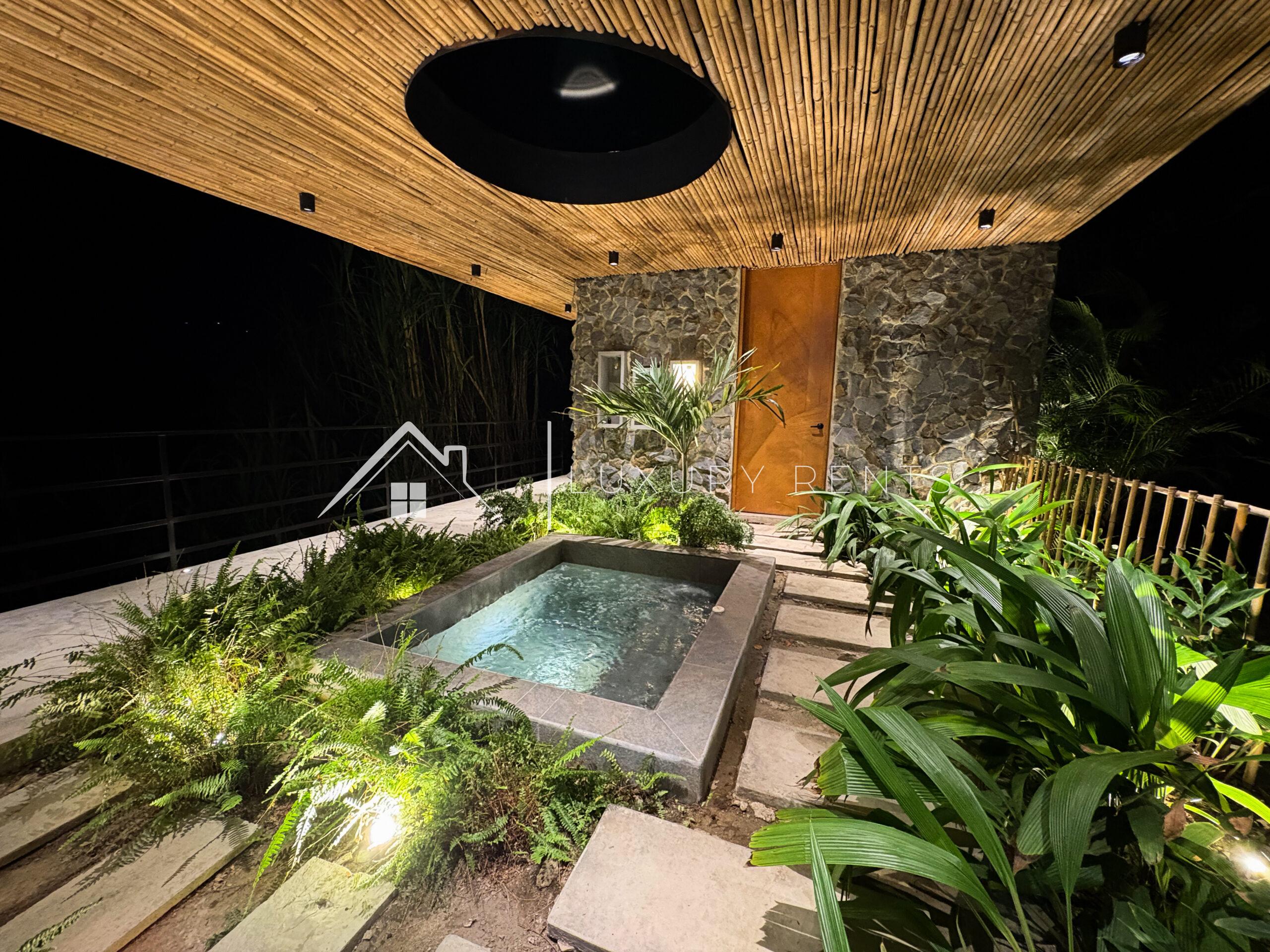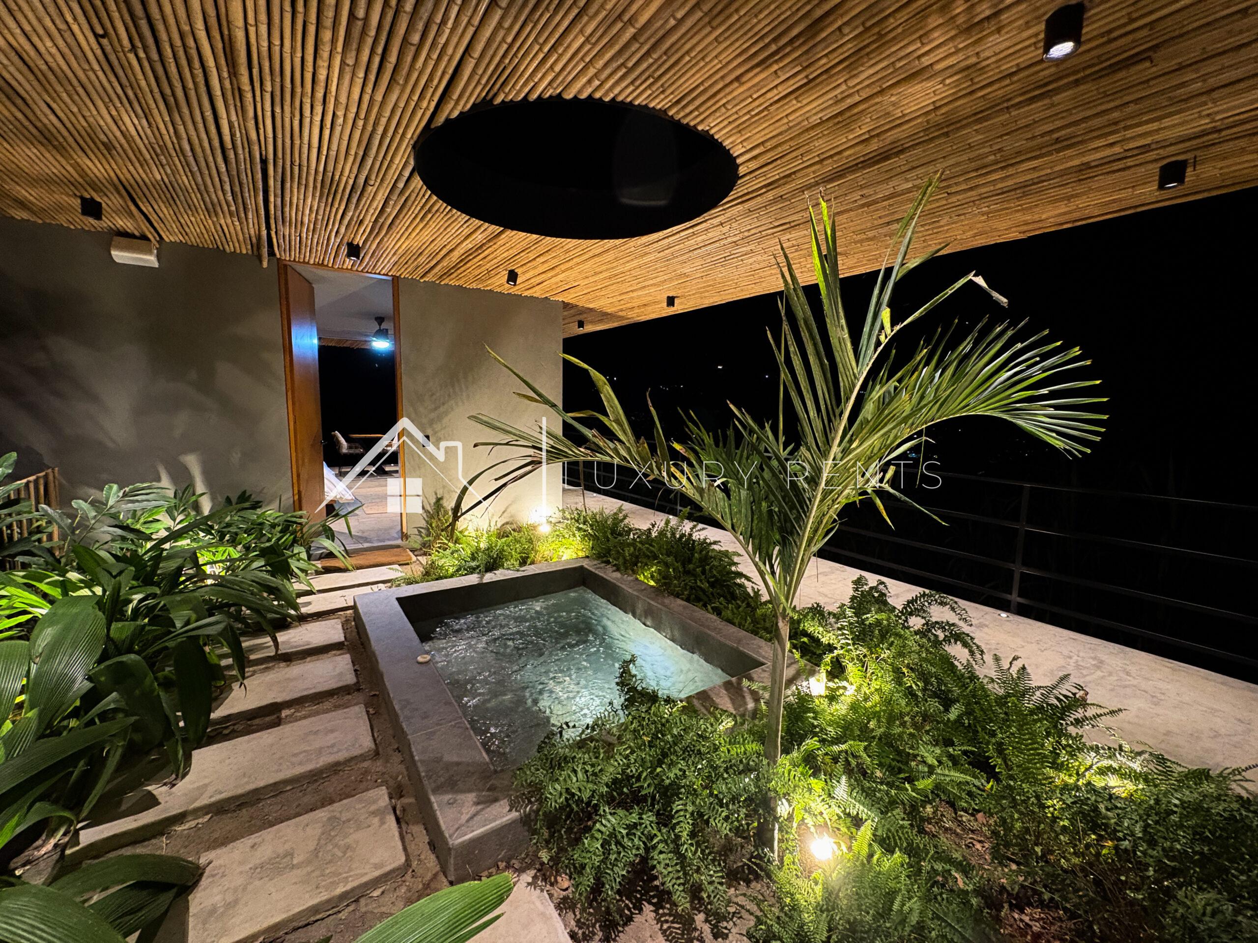 Cuenta con amenidades como malla catamarán 360, jacuzzi privado con calefacción, mini bar (cobro por consumo), wifi, sistema de sonido, desayuno incluido, transporte en buggy desde el parqueadero, parqueaderos privados, zonas de hamacas