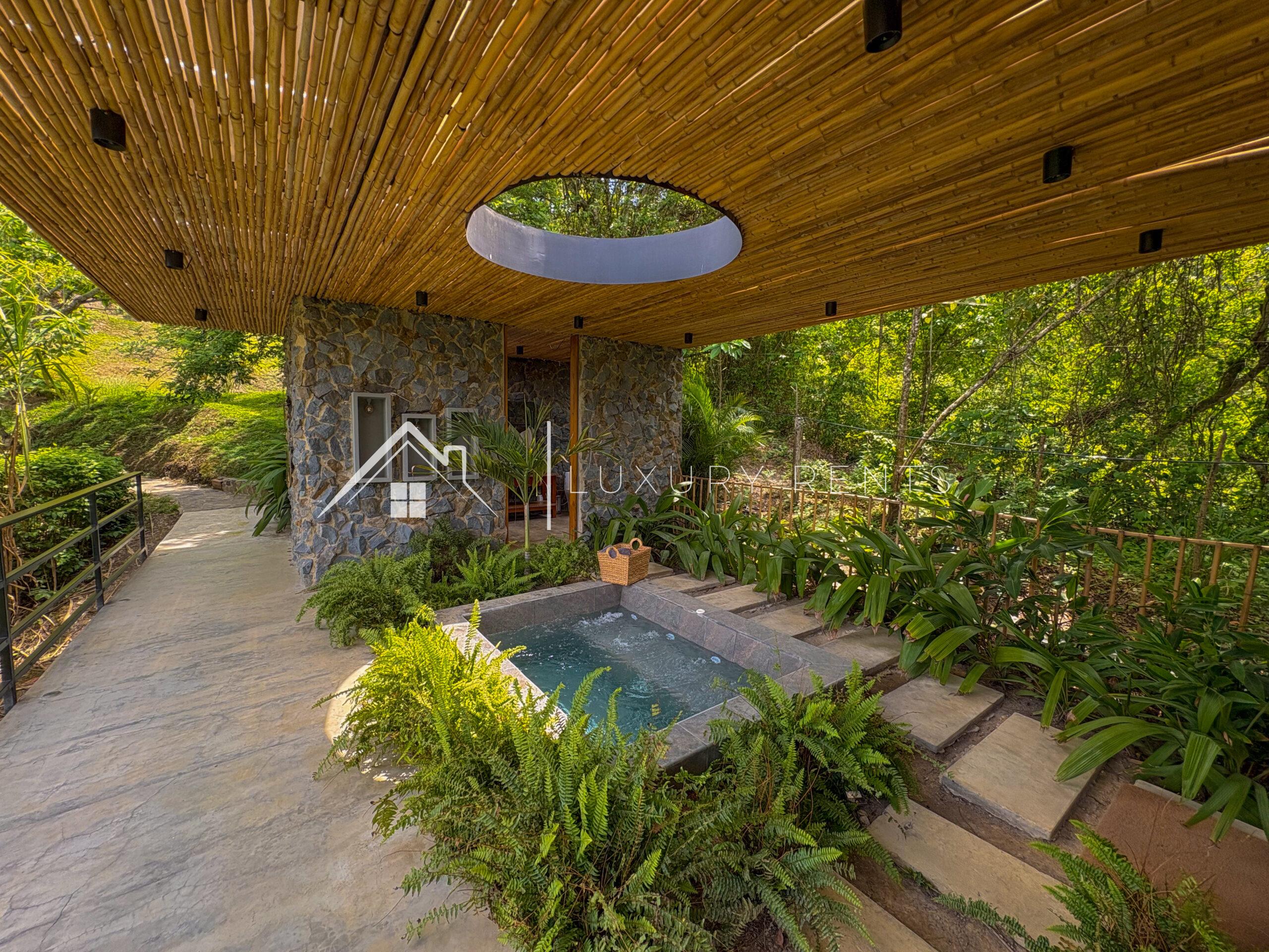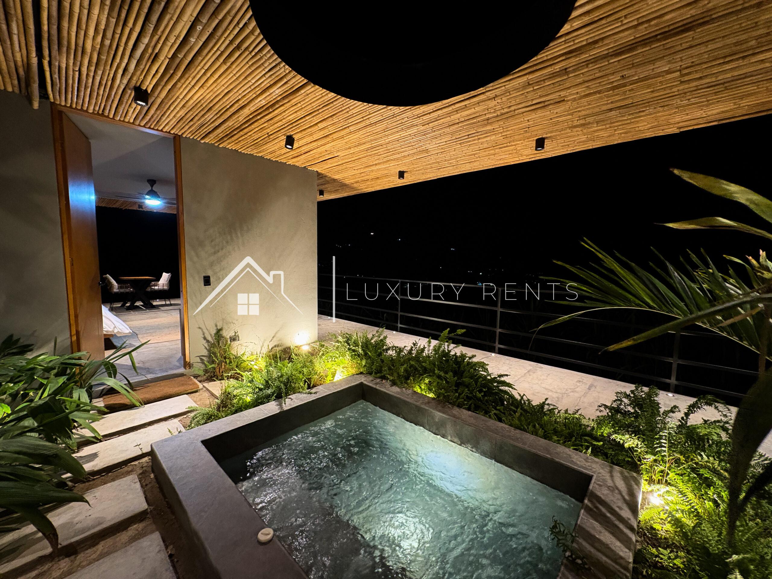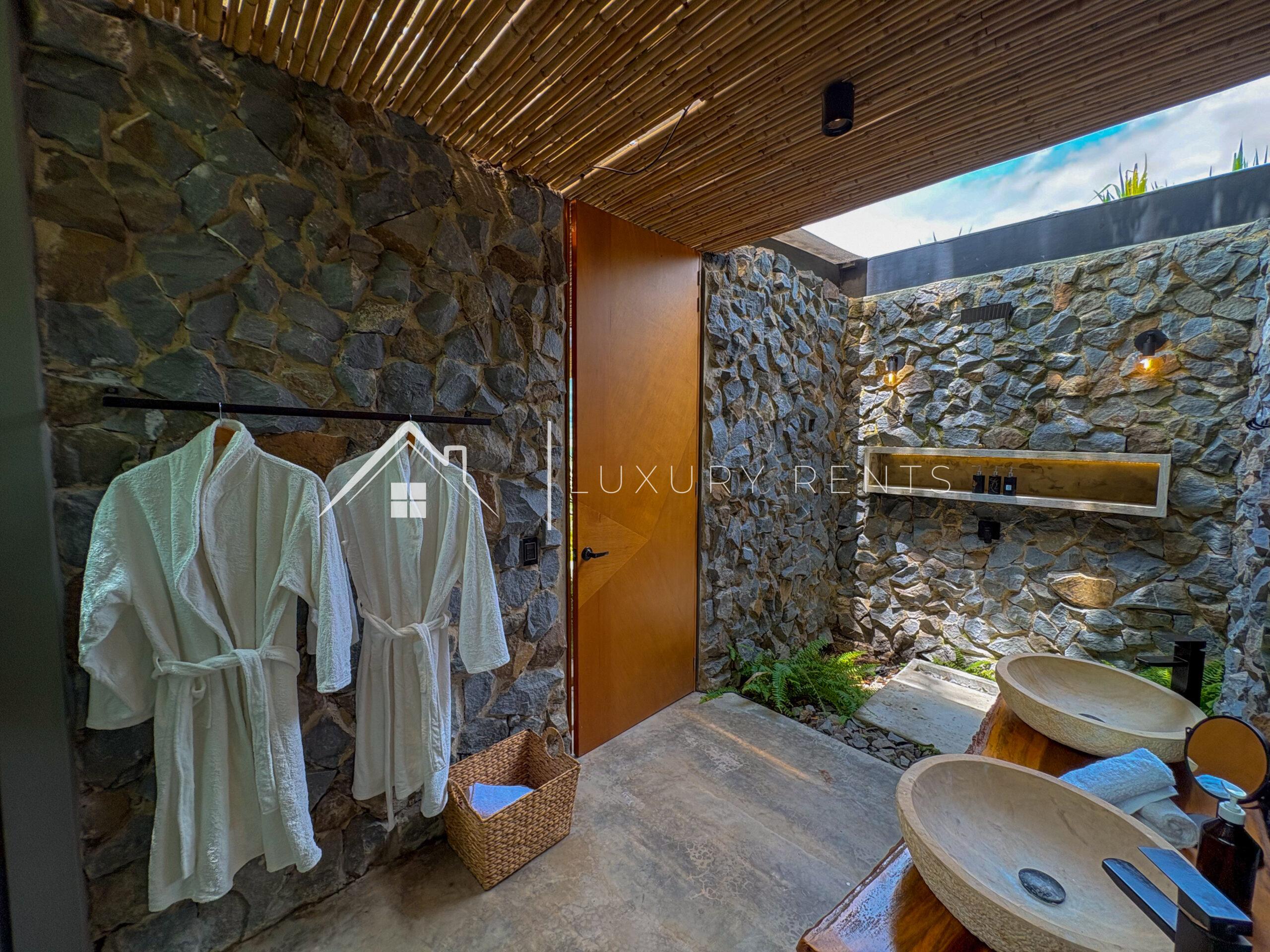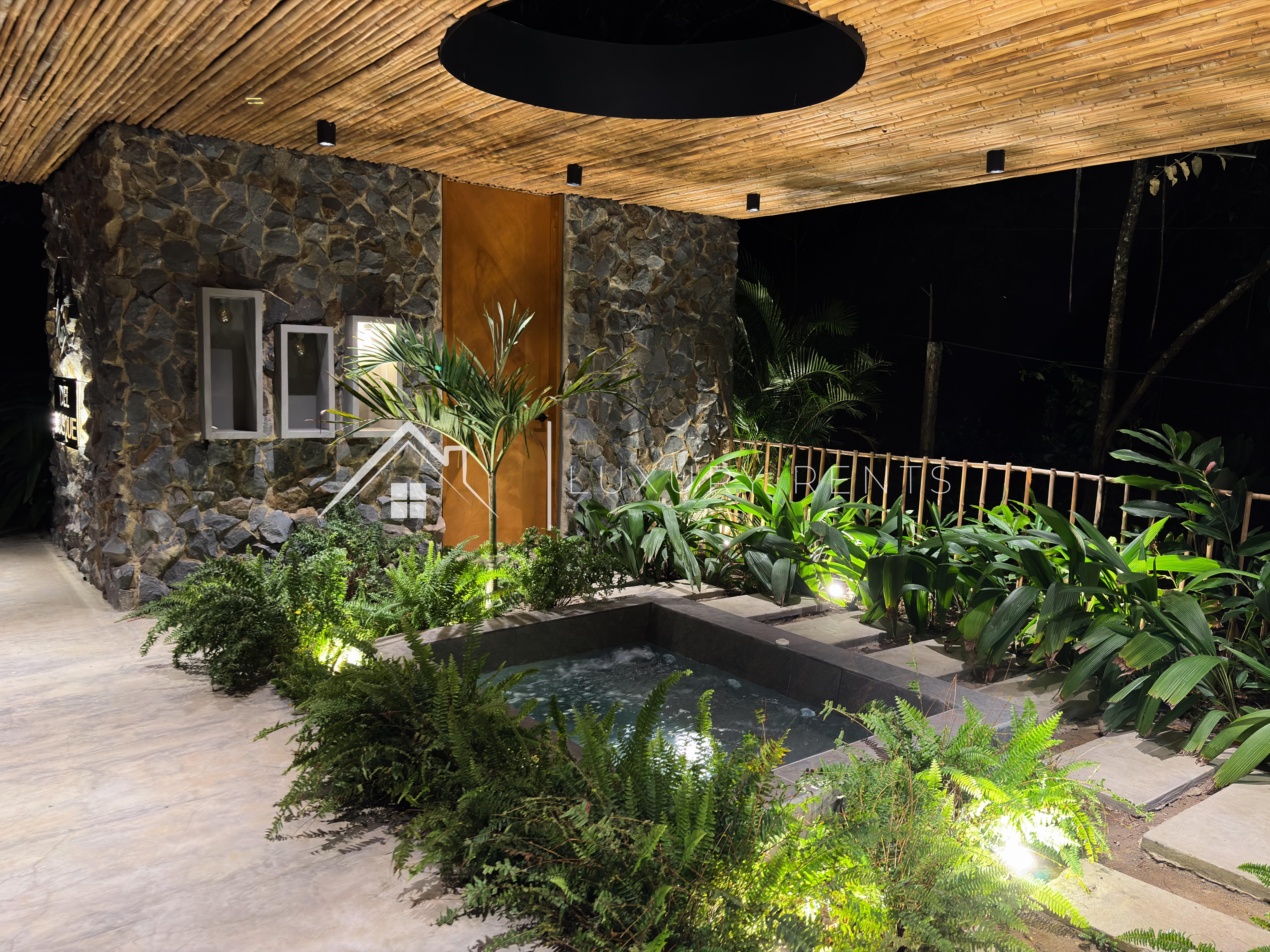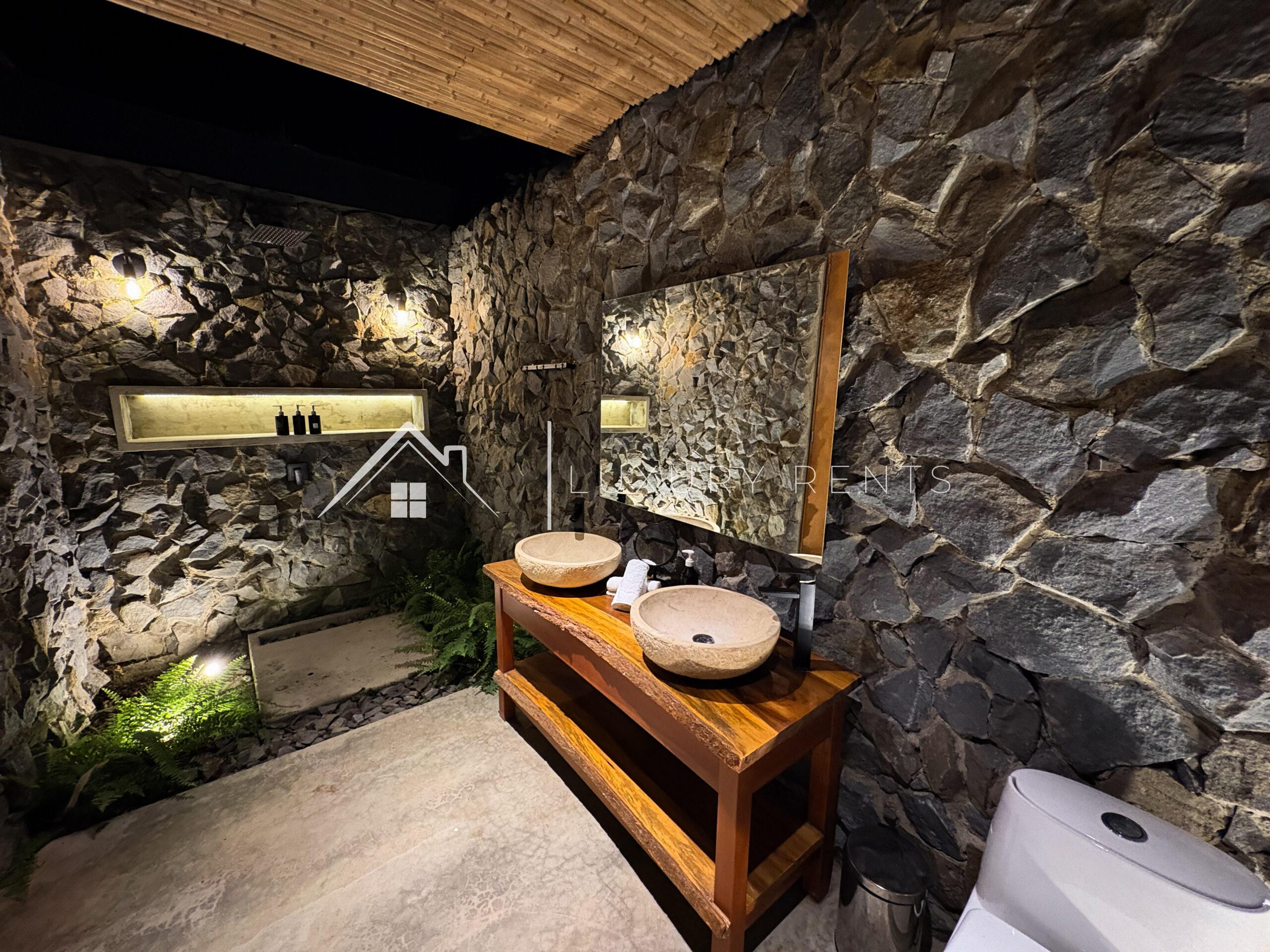 Cuenta con amenidades como malla catamarán 360, jacuzzi privado con calefacción, mini bar (cobro por consumo), wifi, sistema de sonido, desayuno incluido, transporte en buggy desde el parqueadero, parqueaderos privados, zonas de hamacas
