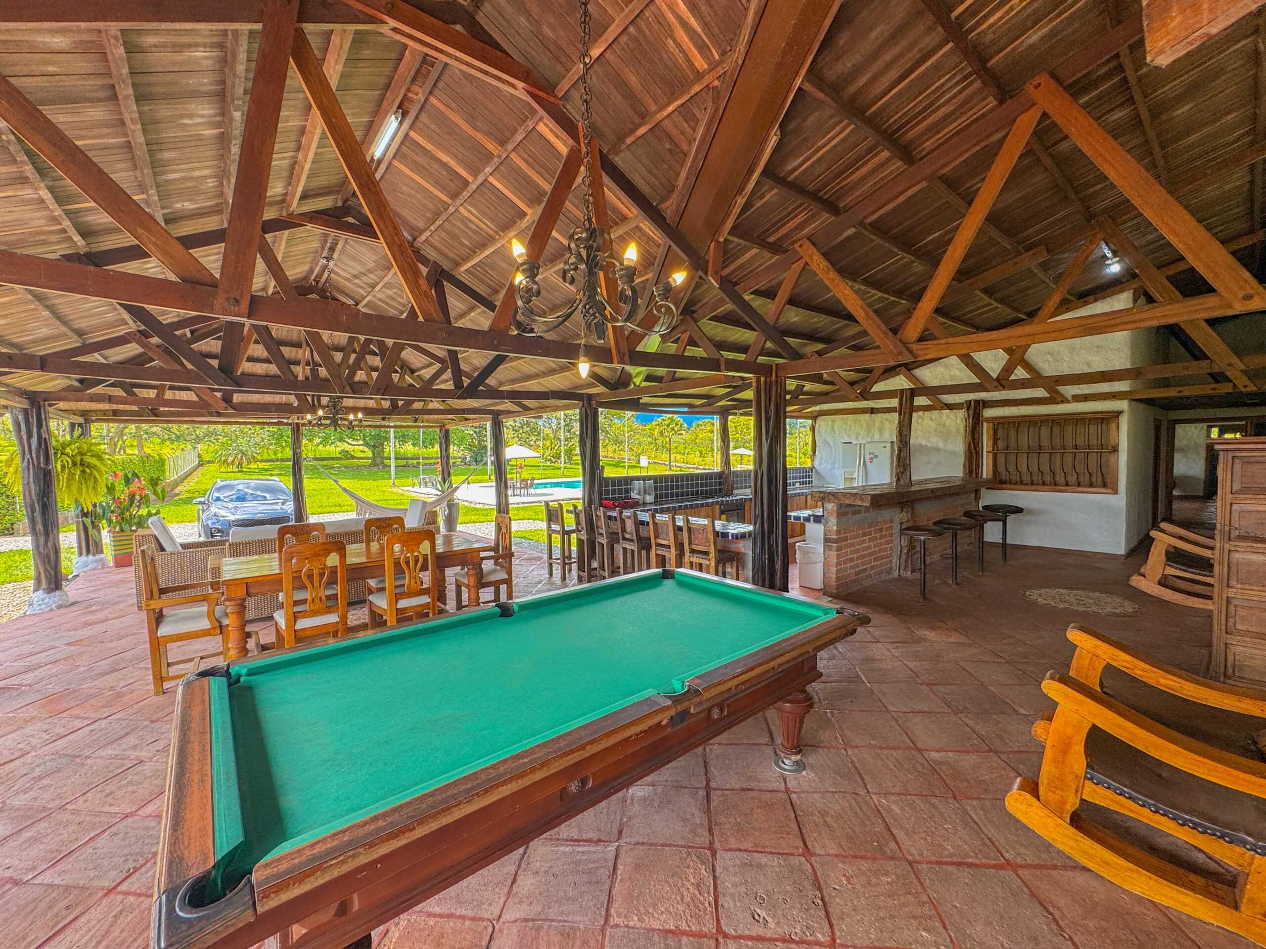 Cuenta con amenidades como mesa de billar, sala y comedor, Cocina equipada & Bbq, Zona de fogatas , Piscina y jacuzzi , Zonas verdes ,Wifi
